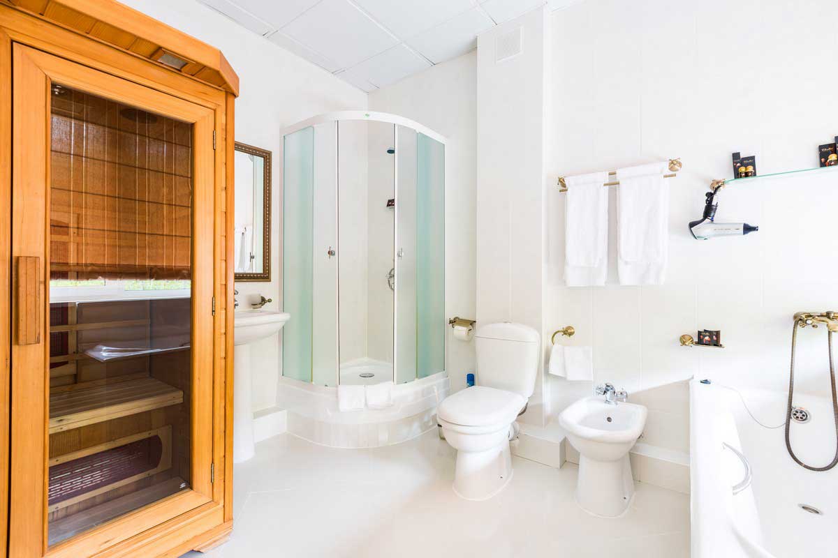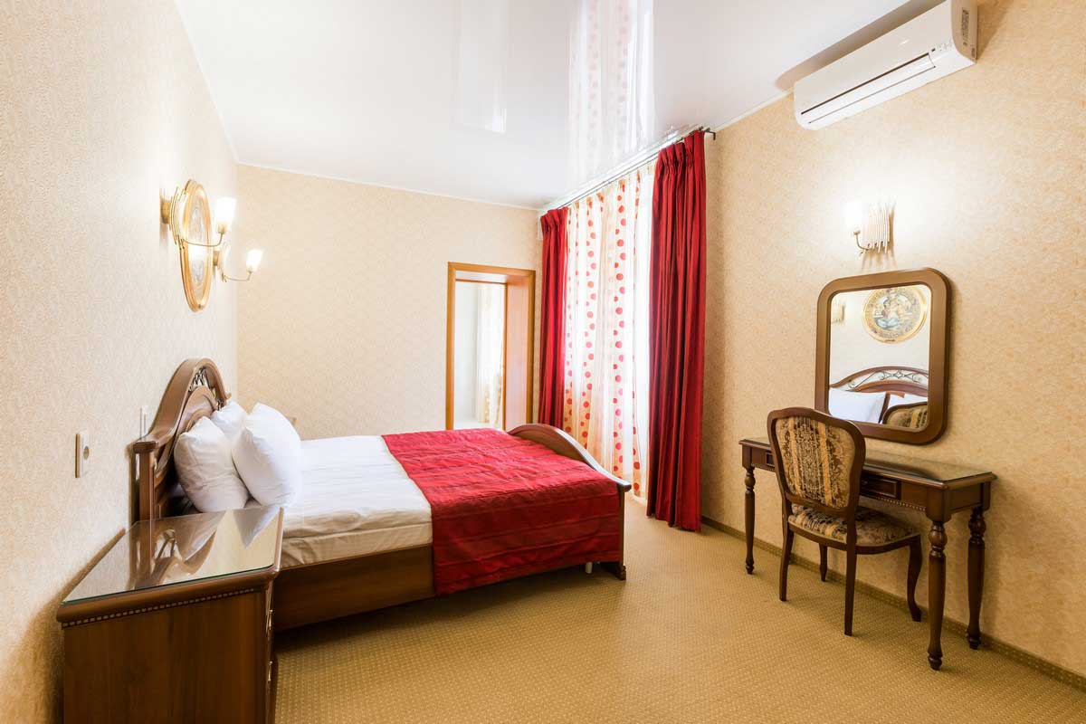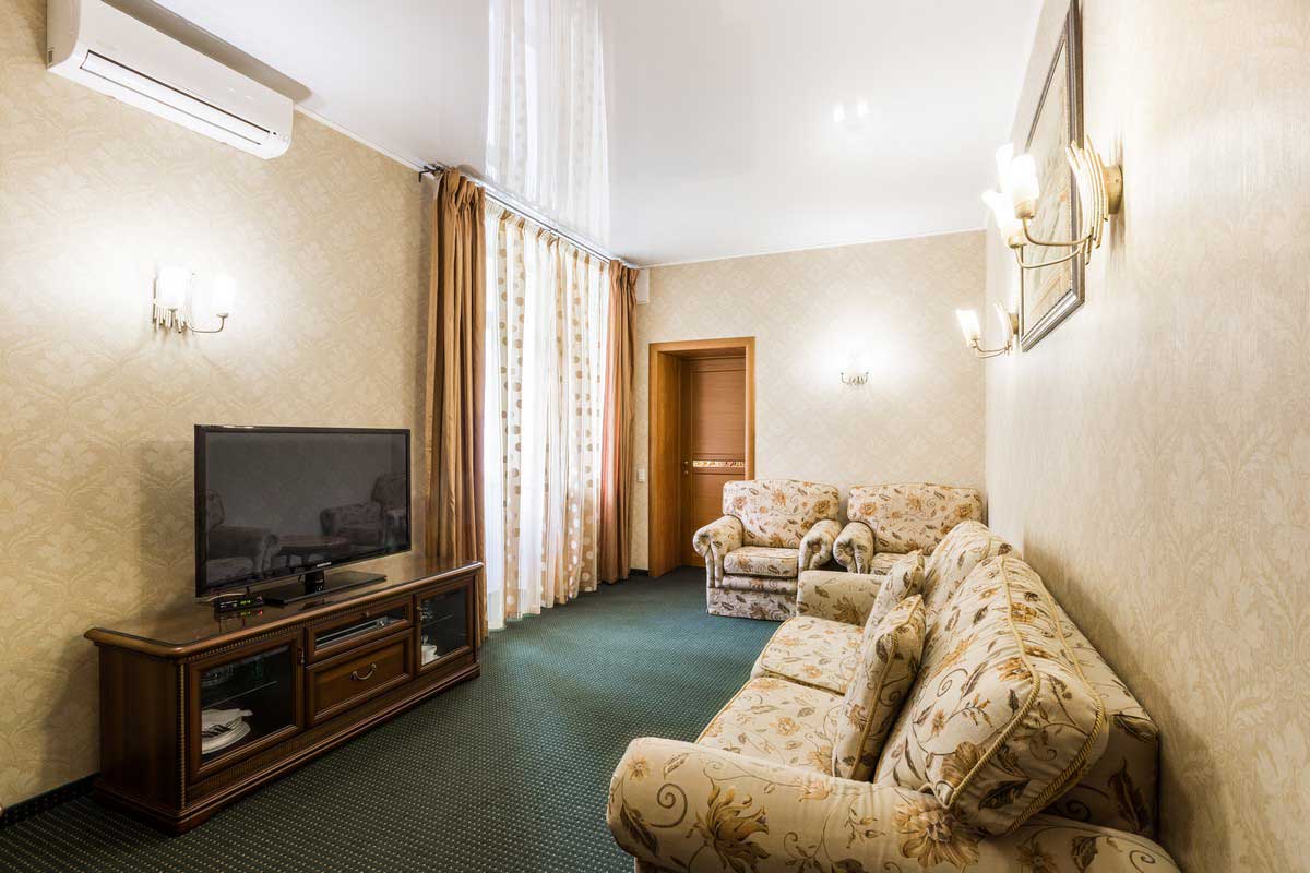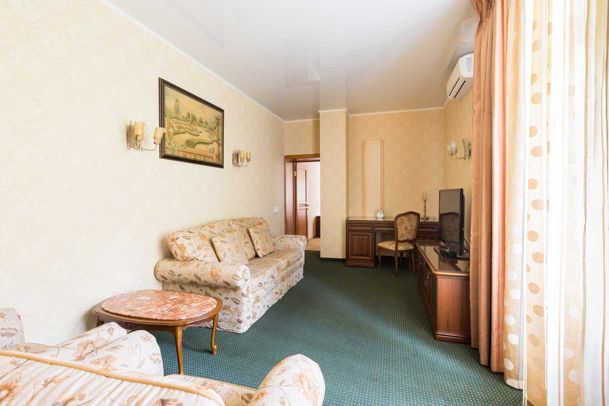 Двухкомнатный номер с процедурной комнатой, с 1 двуспальной кроватью и диваном в зале.
